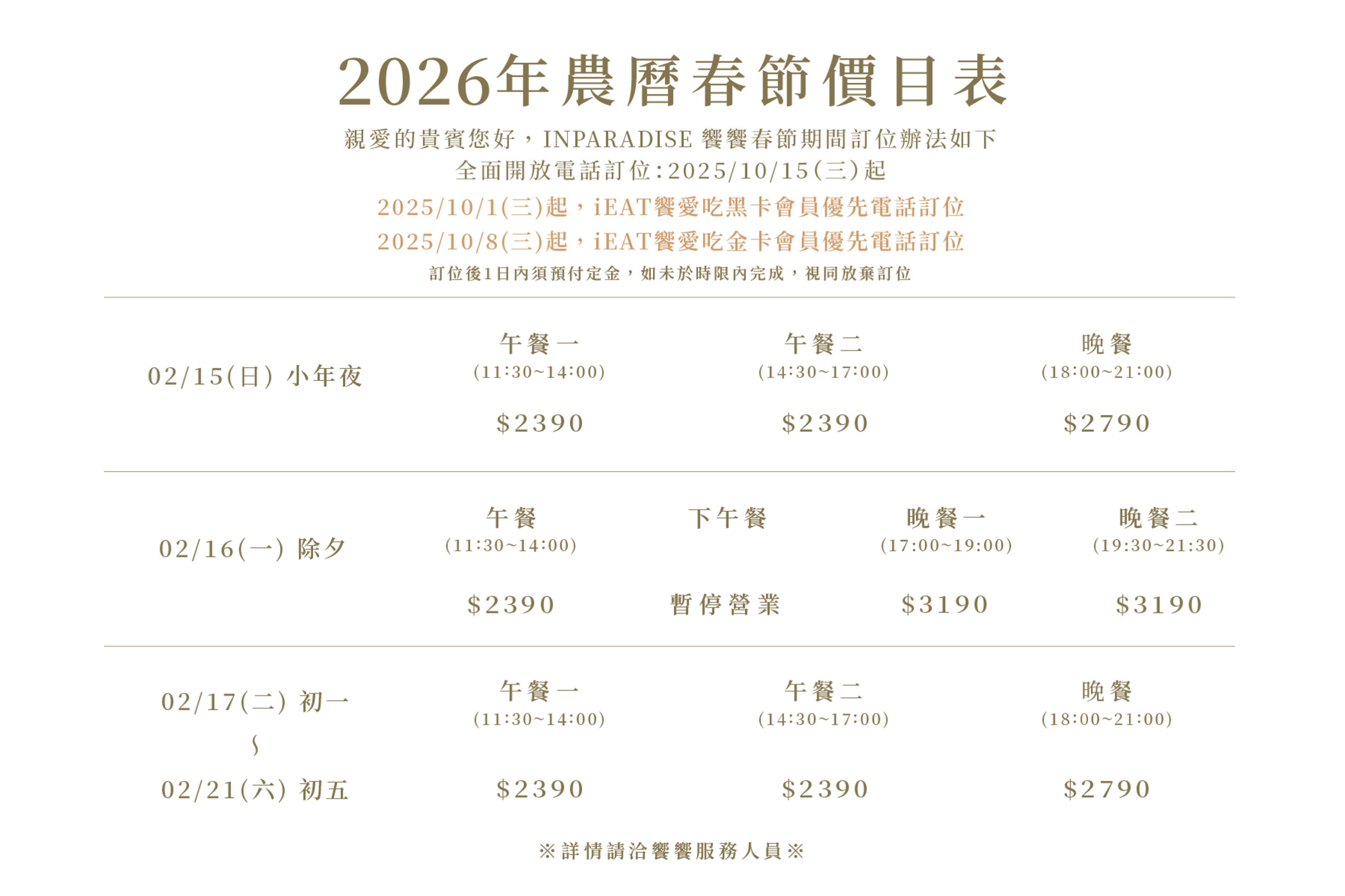 春節期間2026/2/15(小年夜)~2/21(初五) 僅開放電話訂位