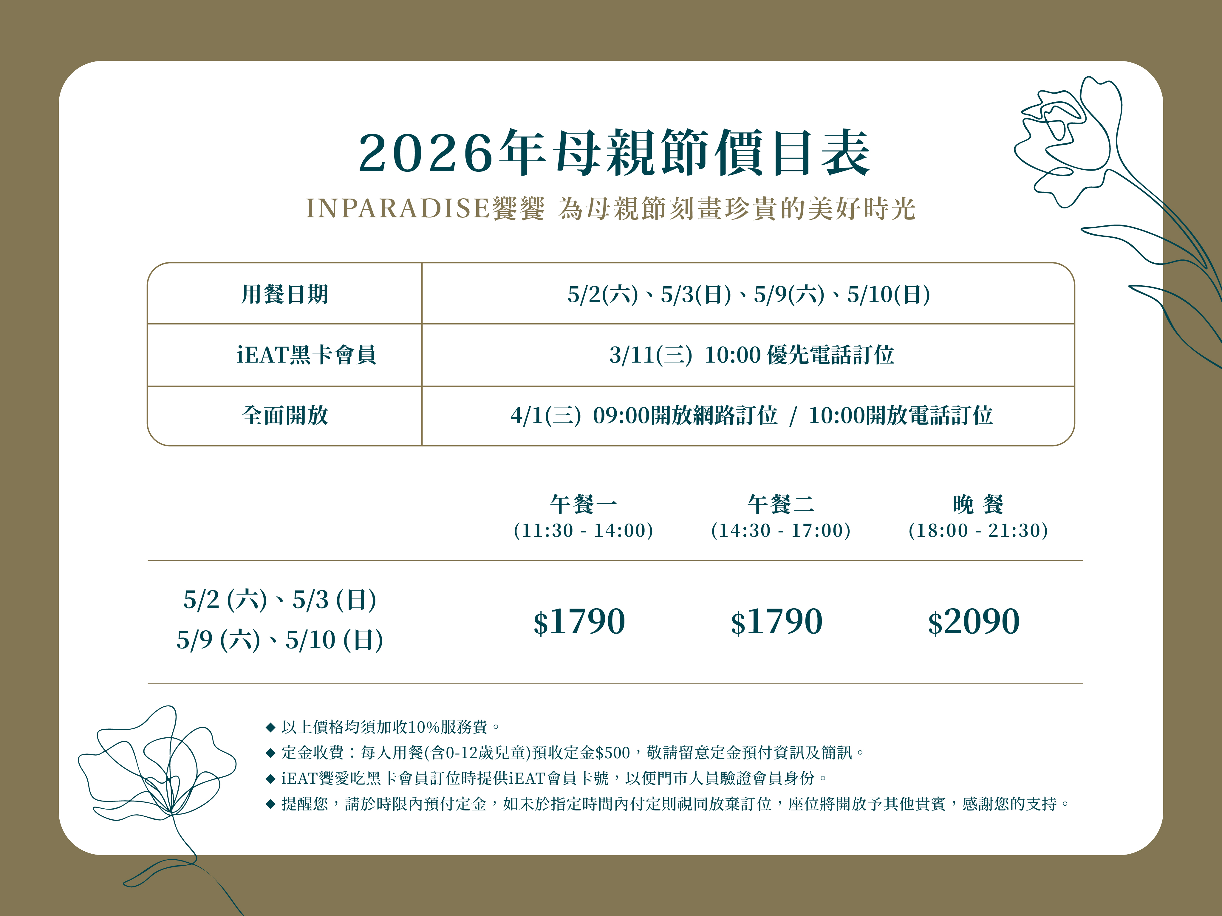 ◆定金收費:每人用餐(含0-12歲兒童)預收定金$500,敬請留意定金預付資訊及簡訊。