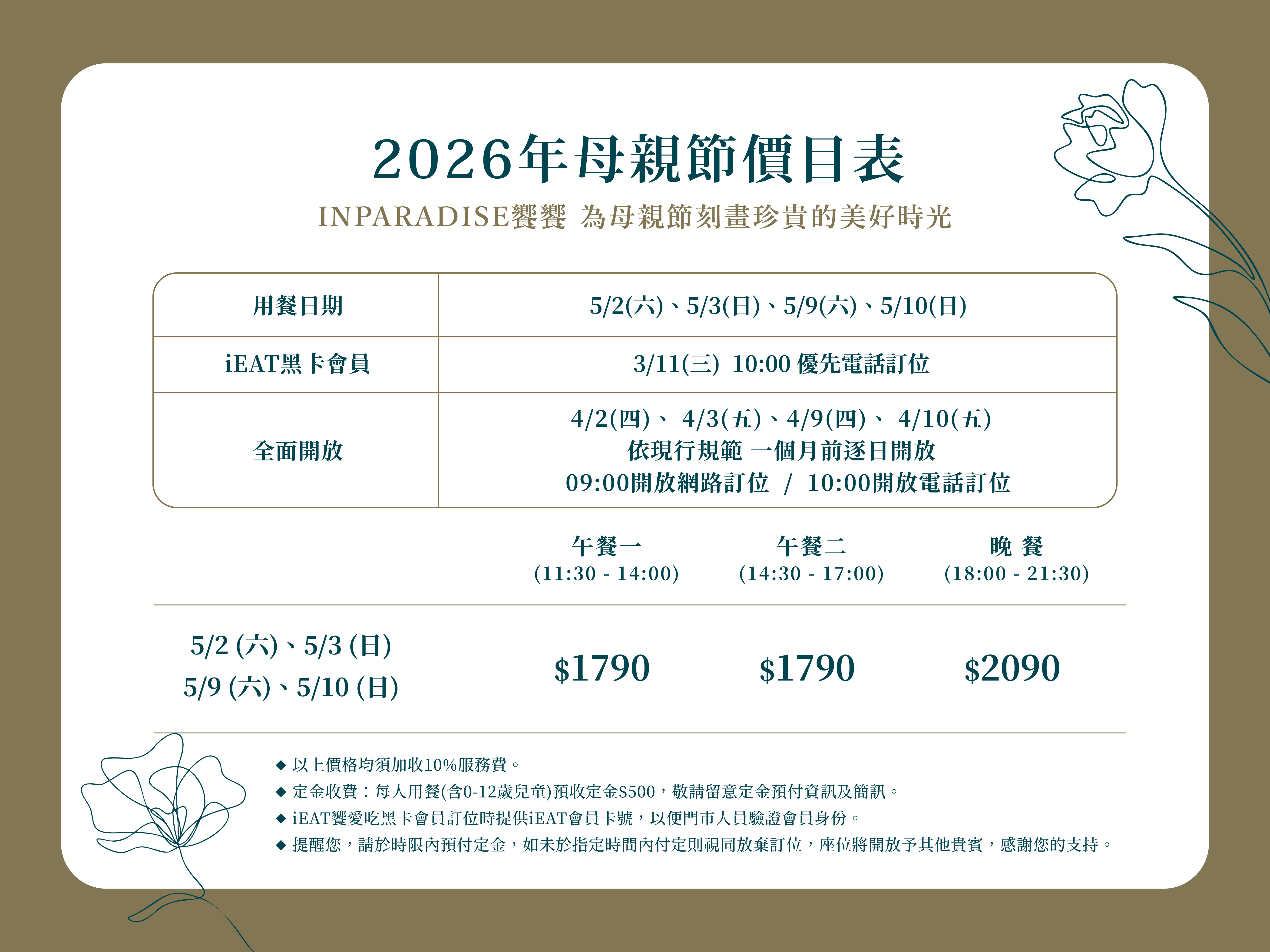 2026年母親節週末 5/2(六)、5/3(日)、5/9(六)、5/10(日)